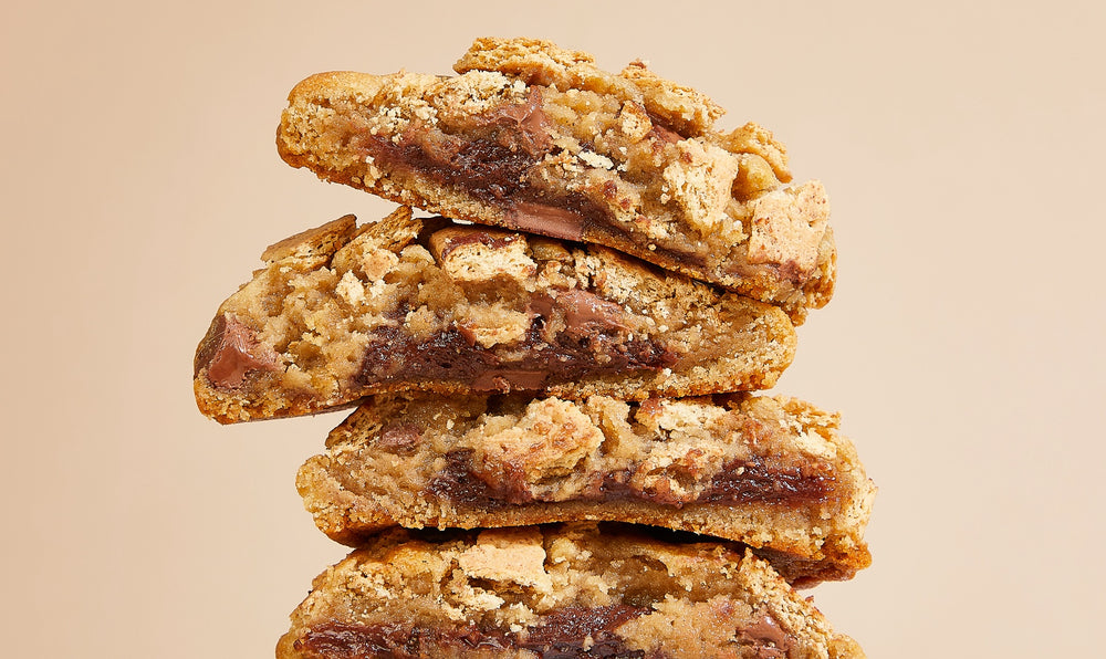Our classic vanilla brown butter cookie mixed with single-origin milk chocolate chunks, stuffed with melt-in-your-mouth chocolate pudding, and topped with graham cracker chunks