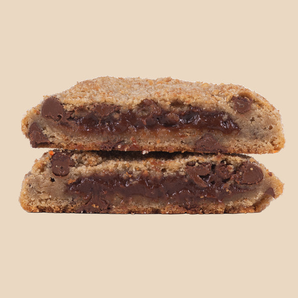 Plant-based vanilla brown butter cookie mixed with Single Origin dark chocolate, stuffed with rich chocolate ganache, and topped with Maldon flaky sea salt