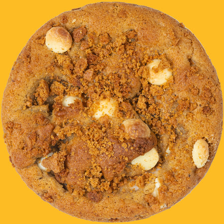 This vanilla brown butter cookie gets infused with our homemade brown sugar syrup, mixed with single-origin white chocolate chips, stuffed with cookie butter + Madagascar Vanilla Bean infused cream cheese frosting, and topped with white chocolate drizzle and Cinnamon Toast Crunch® shortbread crumble